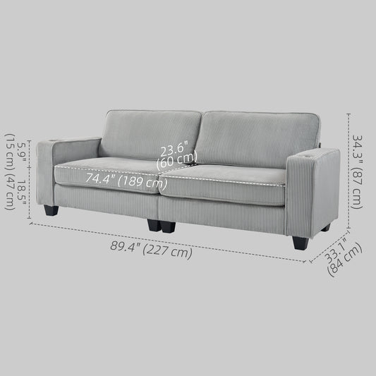 Modern 3-Seater Corduroy Sofa: Pine Wood Legs, Rolled Armrests, Light Grey