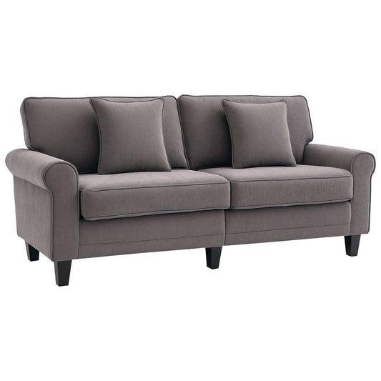 Modern Grey Linen Fabric 3-Seater Sofa Couch with Studded Trim & Rolled Arms