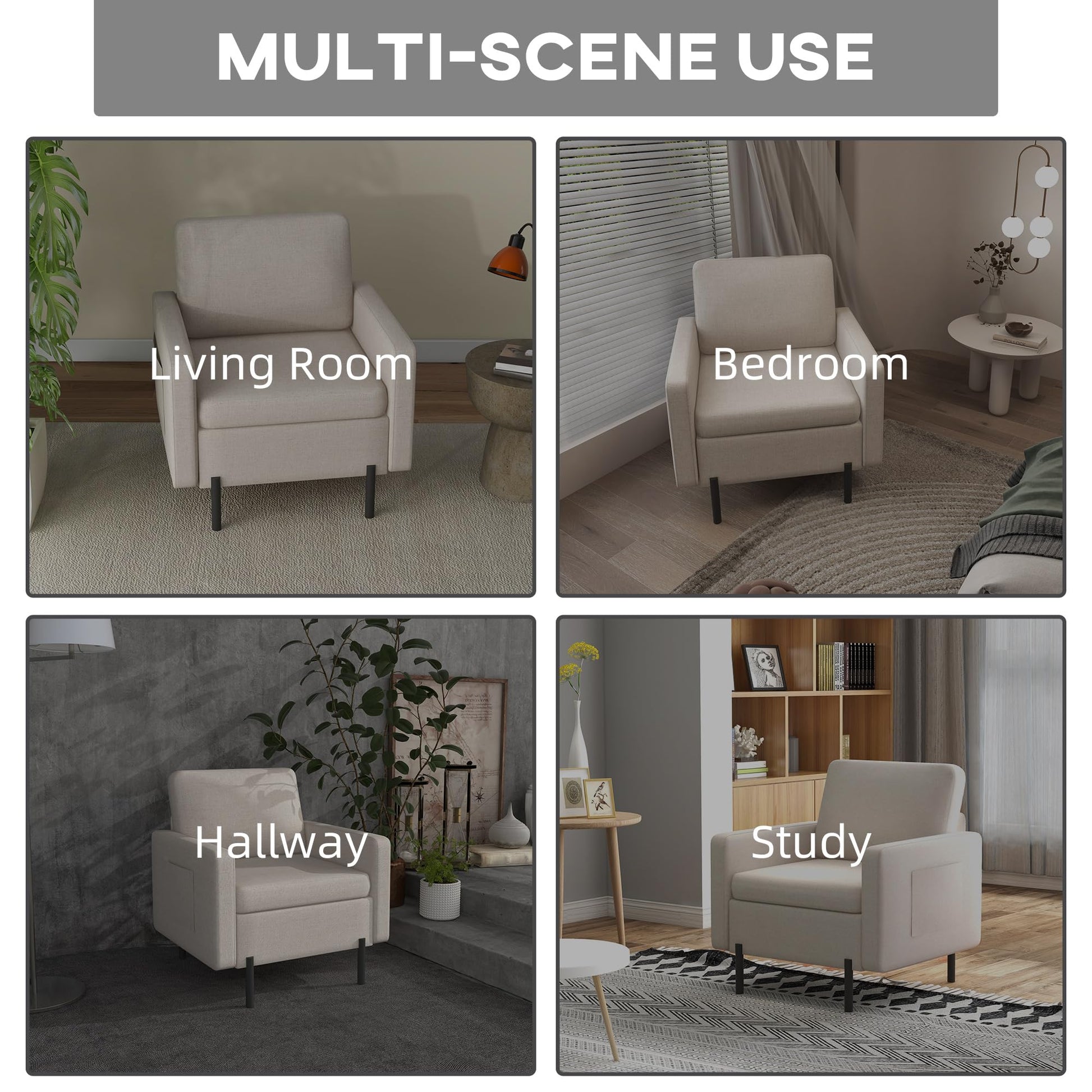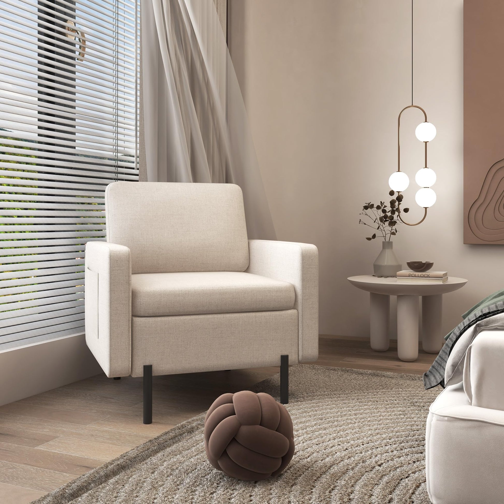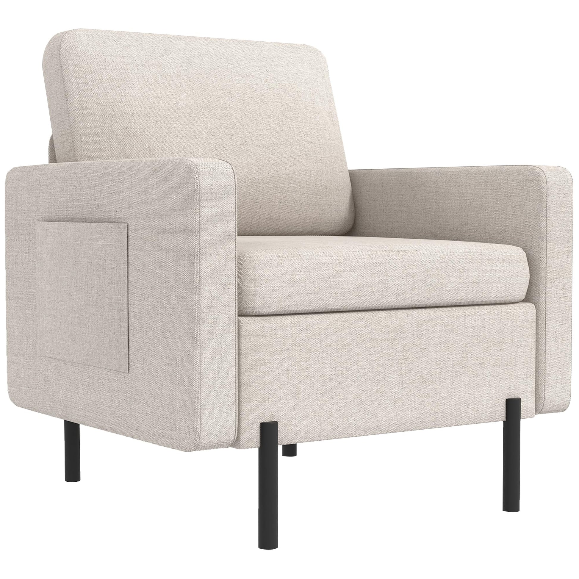 Fabric Accent Chair, Armchair, Modern Living Room Chair with Metal Legs, 2 Side Pockets, Thick Padding for Bedroom, Cream White