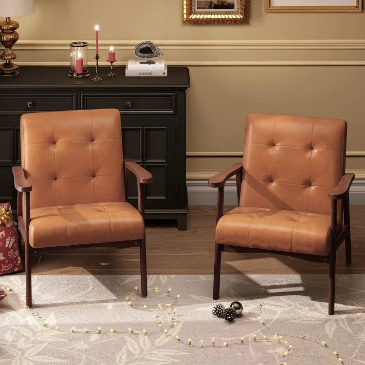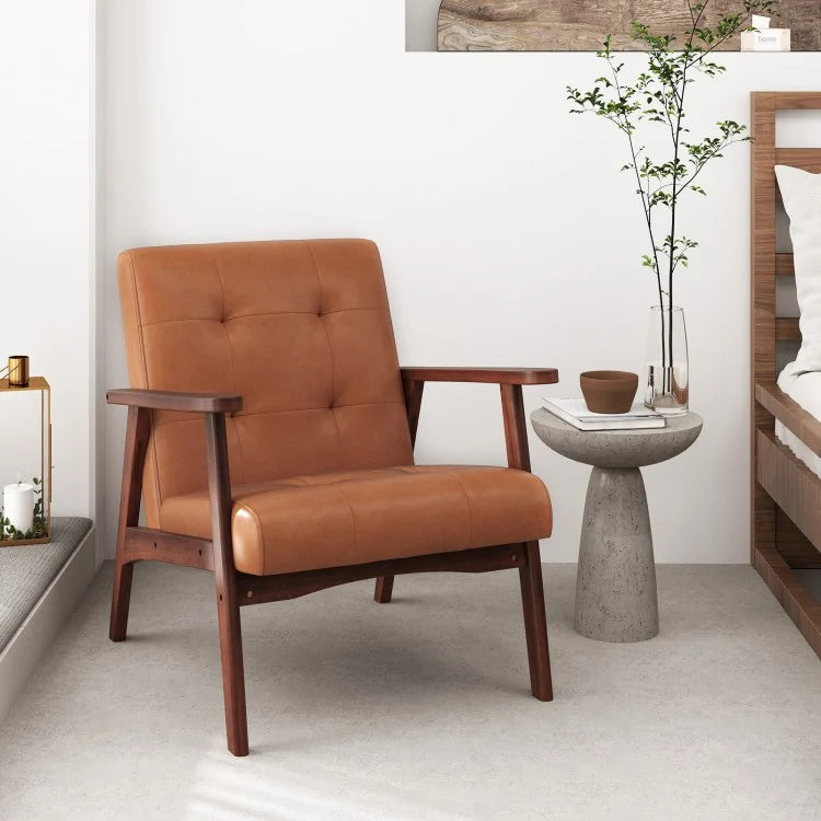 Mid Century Modern Accent Chair with Solid Rubber Wood Frame and Leather Cover