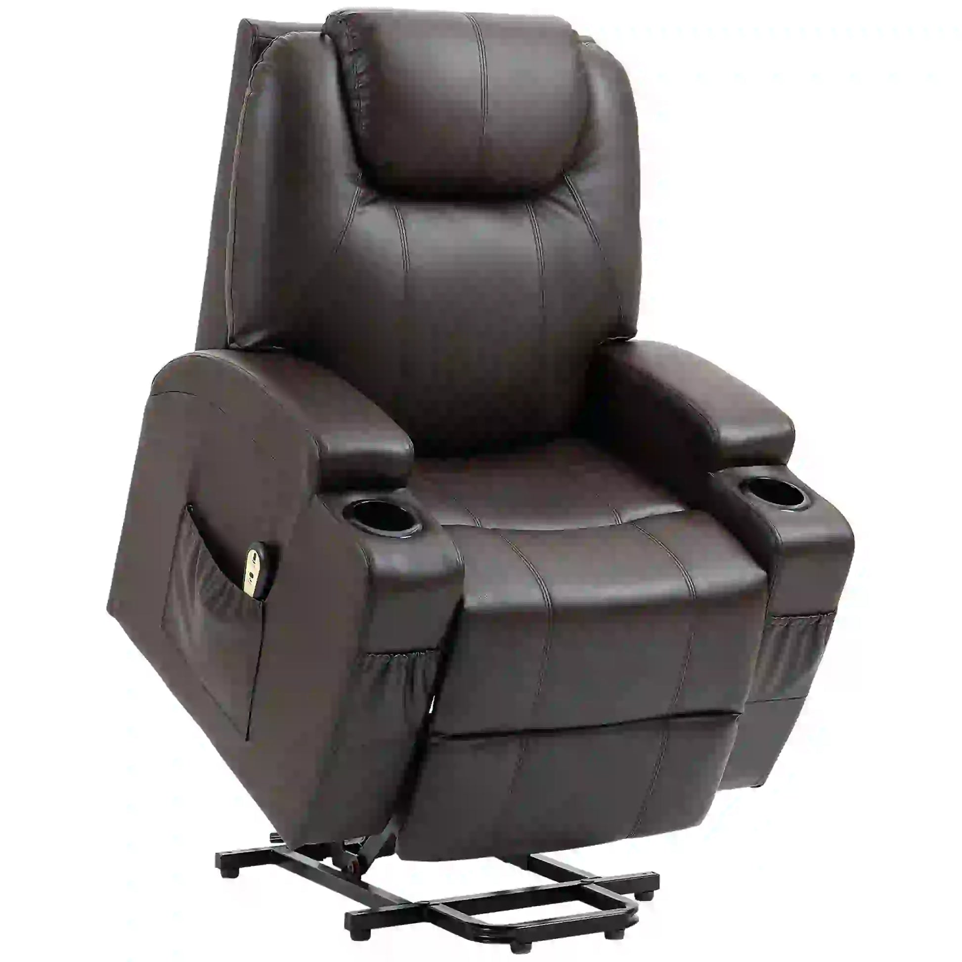 This power lift recliner is designed for comfort and convenience. With a touch of a button, you can go from a standing position to a reclined position without effort. The chair features a sturdy steel lifting mechanism, a thick padded seat, backrest, armrest, and headrest for maximum comfort. It also comes with a remote control, side pockets, and cup holders for added convenience. The chair is made of PU leather and has a modern style that can fit in any living room or bedroom.